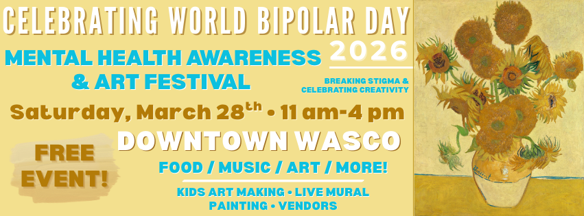 The vision of World Bipolar Day (WBD) is to bring global awareness to bipolar disorder and to eliminate social stigma and discrimination. Since its inception, WBD has officially been observed on March 30, the birthday of the famous Dutch painter Vincent van Gogh, who was diagnosed after his death as likely having bipolar disorder. Because there is a link between bipolar and creativity, Wasco’s World Bipolar Day Festival is designed to